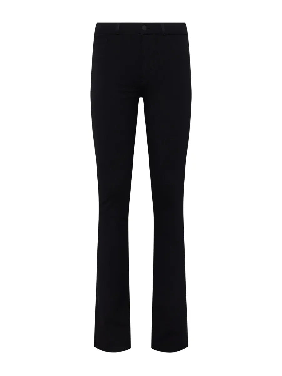 Deze klassieke high-rise bootcut broek in diepzwart ponte is ontworpen voor een flatterend silhouet. De gevormde tailleband sluit mooi aan in de natuurlijke taille, volgt elegant de lijnen van heup tot knie en loopt uit in een slanke bootcut zoom. Dankzij het high-recovery ponte blijft de stof perfect in vorm en biedt het een gladmakend effect met optimaal draagcomfort. Afgewerkt met vijf zakken en een ritsgulp.
